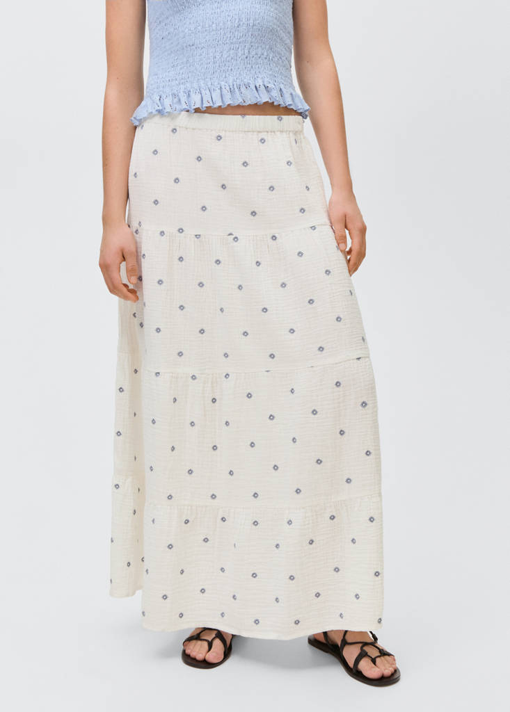 Baumwollstoff. Bambula-Stoff. Bestickter Stoff. Langes Design. Gerades Design. Lagen-Design. Elastischer Bund