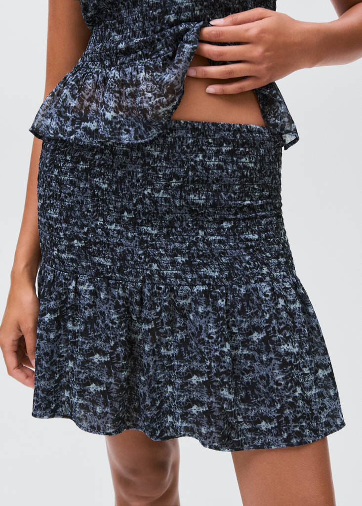 Fließender Stoff. Gerades Design. Bedrucktes Design. Elastischer Taillenbund im Wabenmuster. Gerüschter Saum