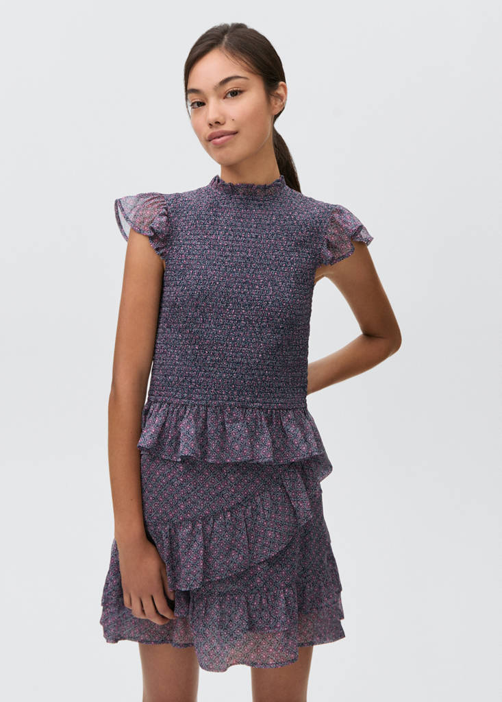 Fließender Stoff. Gerades Design. Kurzes Design. Rüschen-Detail. Blumenmuster. Total Look