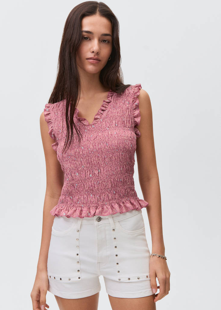 Gesmokter Stoff. Kurzes Design. Gerades Design. Bedrucktes Design. V-Ausschnitt. Ärmellos