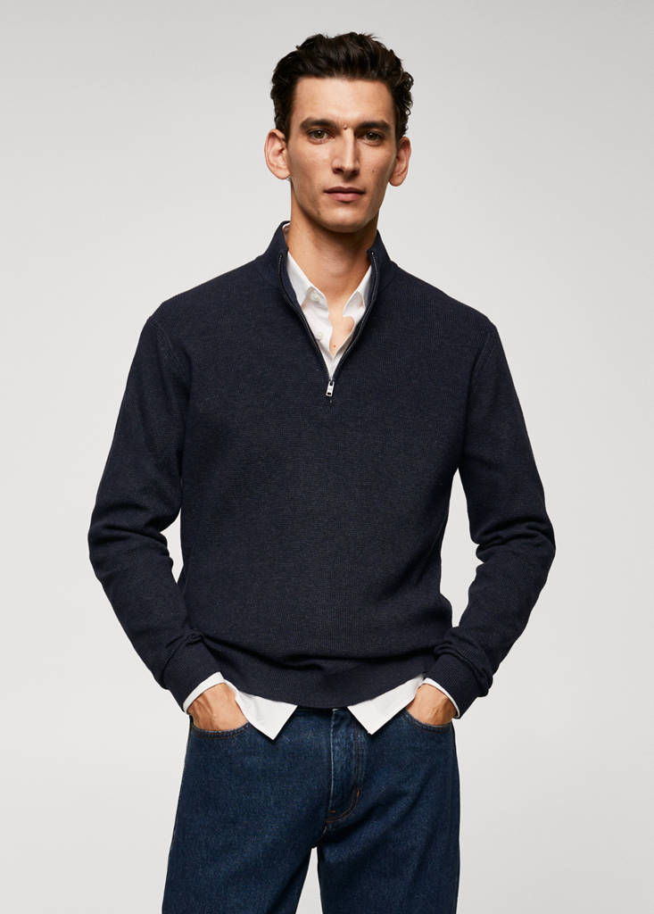 Cotton and polyester blend fabric. Fine knit fabric. Micro check structure. Regular fit. Perkins collar with zip closure. Long sleeves with elastic cuffs. Straight hem with ribbed ends