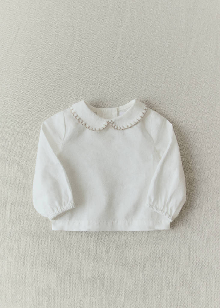 100% Cotton. Straight design. Babydoll collar. Embroidered detail. Long puffed sleeves. Button fastening on the back section. Maternity Collection