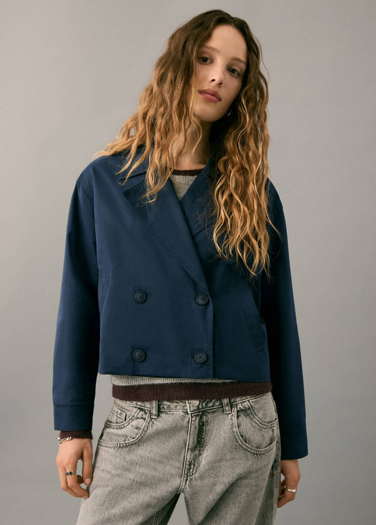 Wrap design. Short design. Balloon Silhouette. Lapel collar. Long sleeves. Cuffs with flap and button. Front closure with crossed buttons. Two side pockets. With inner lining