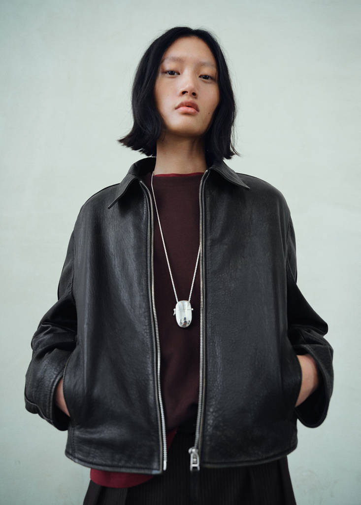 100% sheepskin. Nappa leather. Straight design. Notched lapel collar. Two side pockets. Zip fastening on the front section. Inner lining