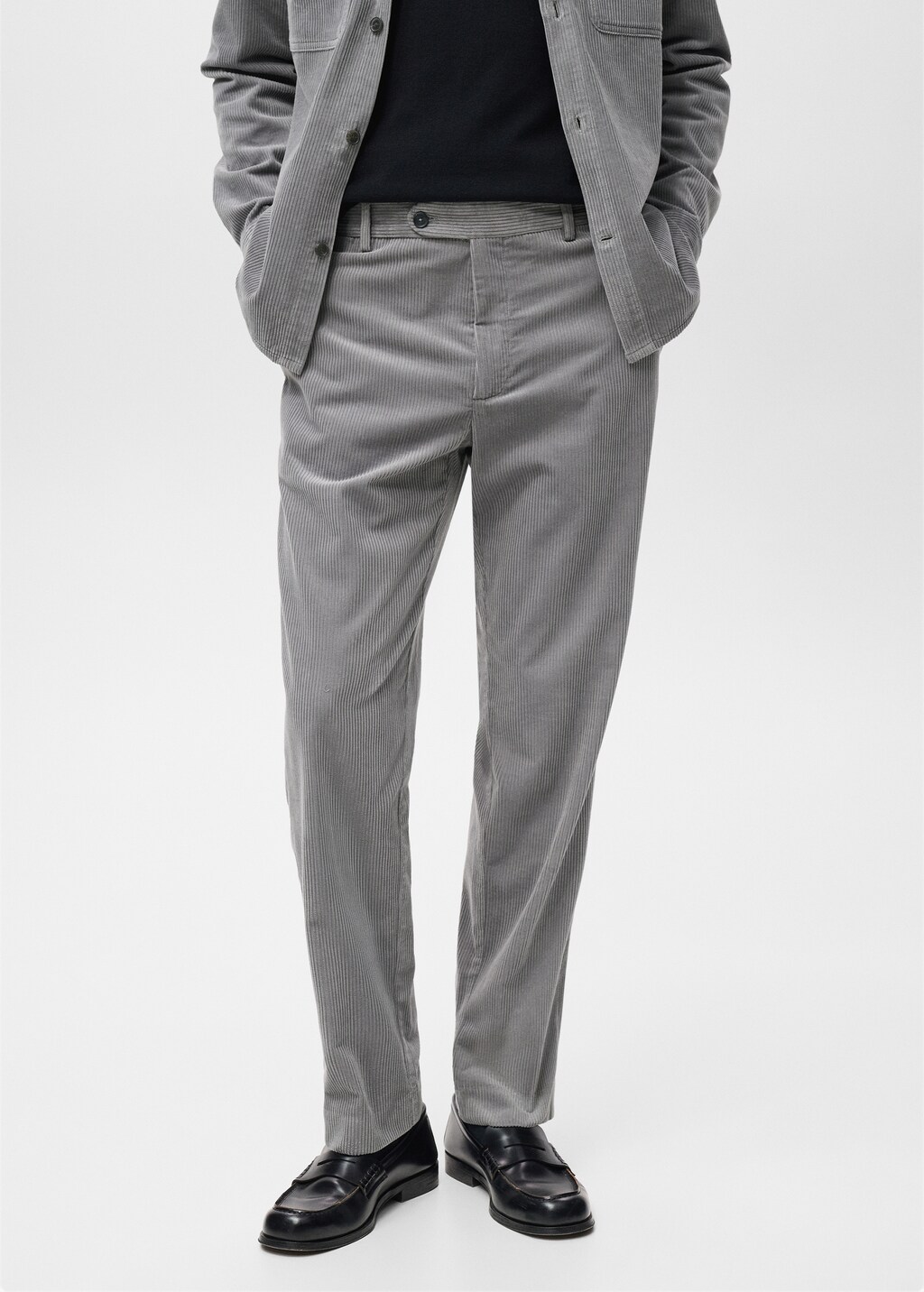 Tiro medio. Regular fit. Tejido de pana. Detalle de raya planchada en la parte delantera y trasera. Cierre delantero de doble botonadura y cremallera. Bolsillo portamonedas a la altura de la cadera. Trabillas para cinturón. Dos bolsillos laterales. Dos bolsillos de ribete y botón en la parte posterior.