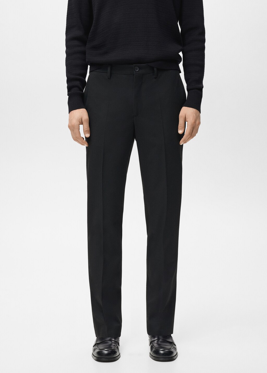 Slim fit. Tejido de algodón. Detalle de raya planchada en la parte delantera y trasera. Dos bolsillos de ribete laterales. Cierre de doble botonadura. Dos bolsillos de ribete en la parte posterior. Trabillas para cinturón.