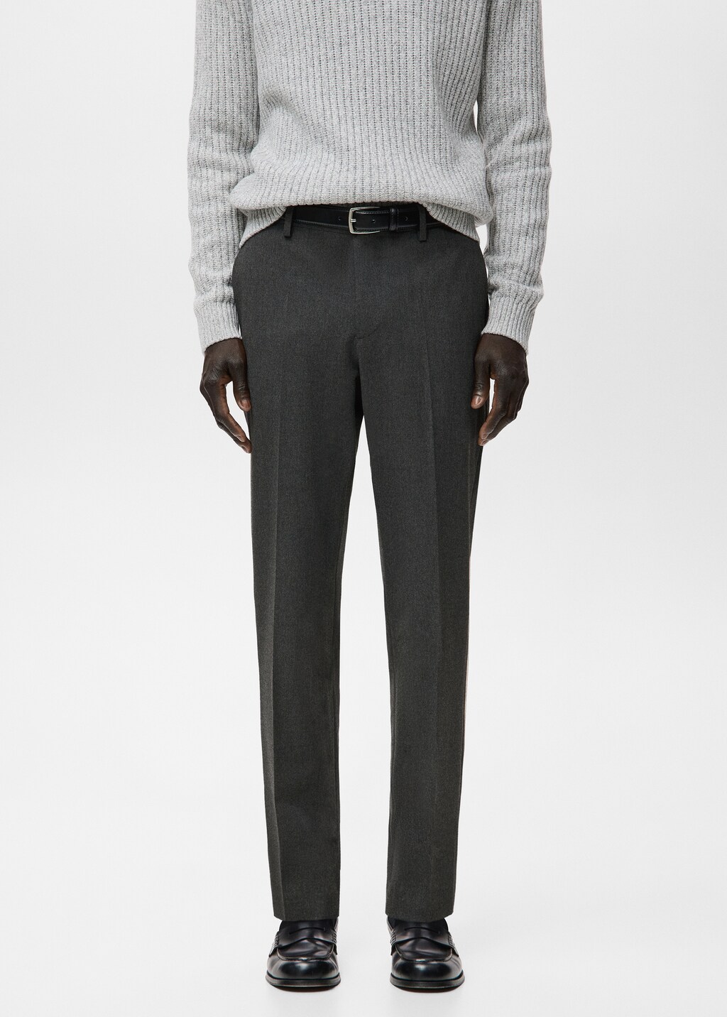 Slim fit. Tejido de algodón. Detalle de raya planchada en la parte delantera y trasera. Dos bolsillos de ribete laterales. Cierre de doble botonadura. Dos bolsillos de ribete en la parte posterior. Trabillas para cinturón.