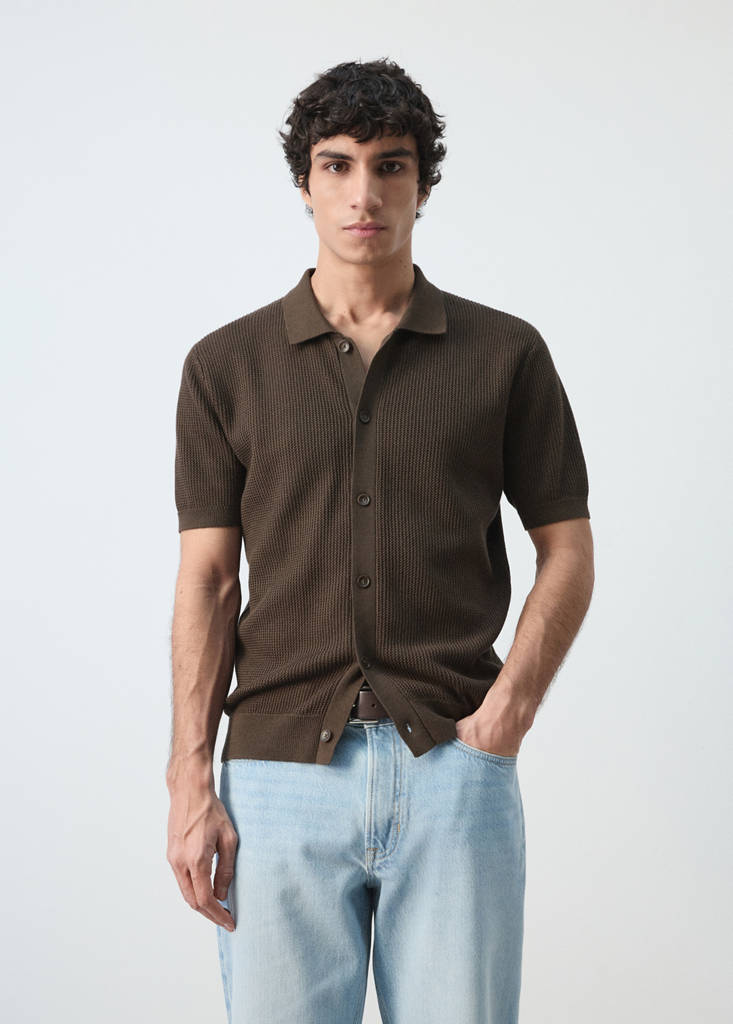 100% Algodón. Tejido de punto estructura. Regular fit. Largo Standard. Cuello camisero. Manga corta. Cierre de botones. Cuello, puños y bajo acabados en rib