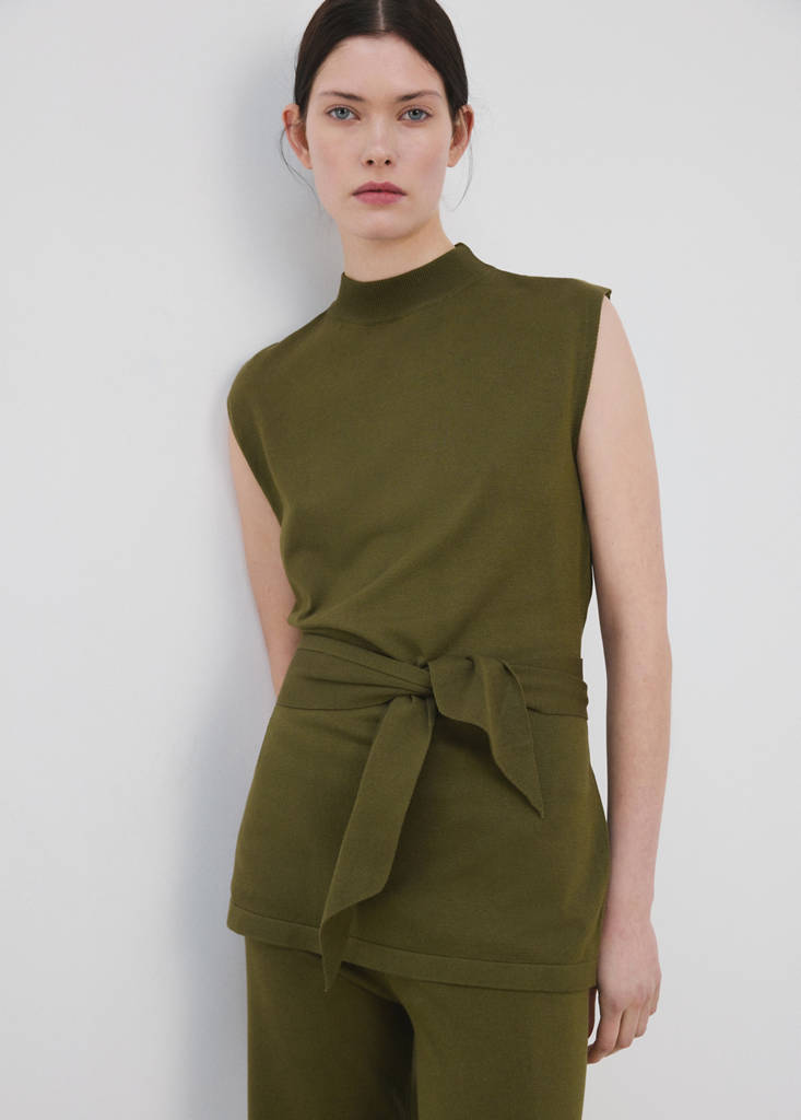 Tejido de punto fino. Diseño recto. Cuello perkins. Manga corta. Detalle cinturón en la cintura. Sin cierre. Disponible Plus. Total look