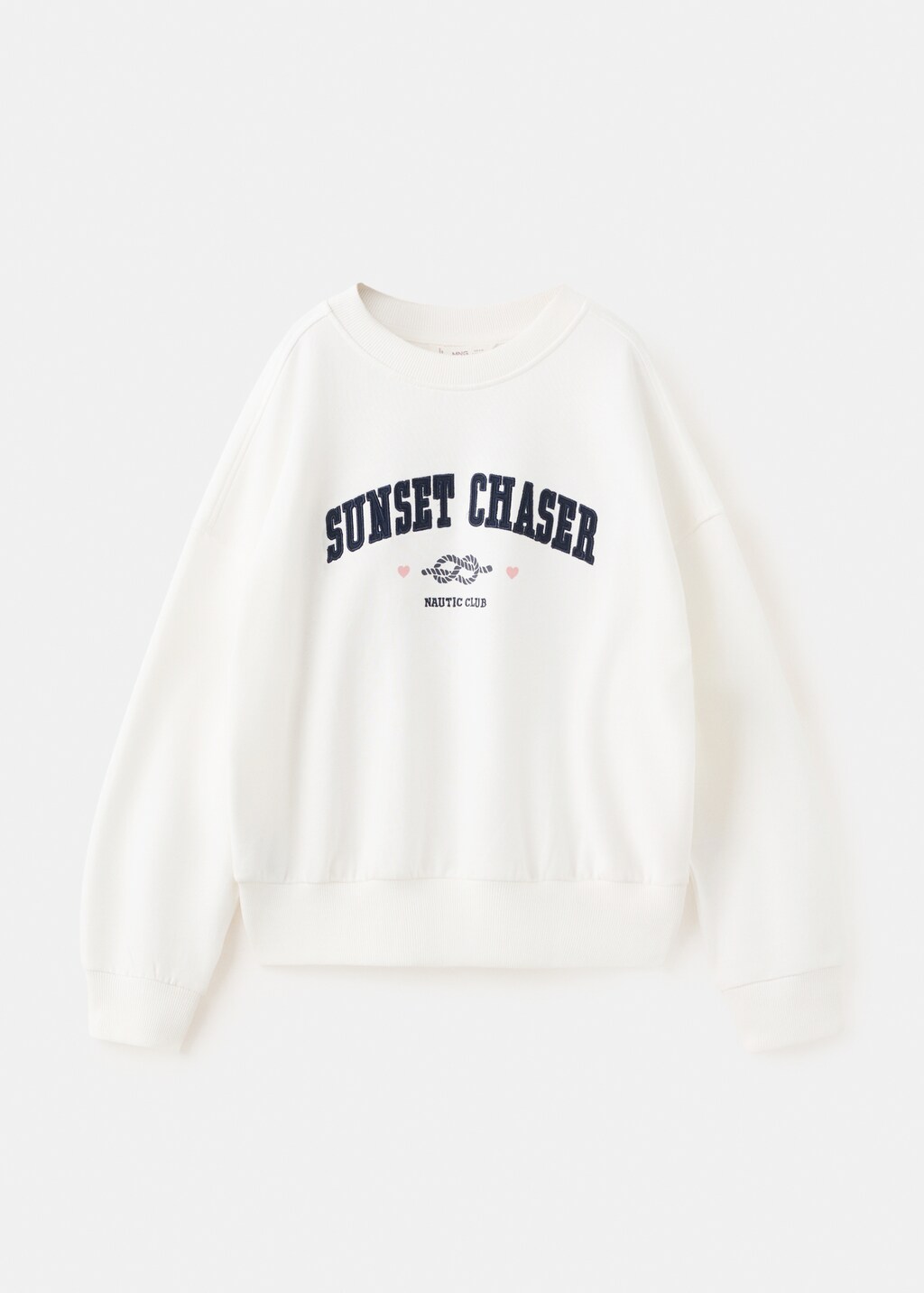 Tejido 100% algodón. Diseño recto. Cuello redondo. Manga larga. Texto estampado en el pecho. Dibujo estampado en la parte trasera.