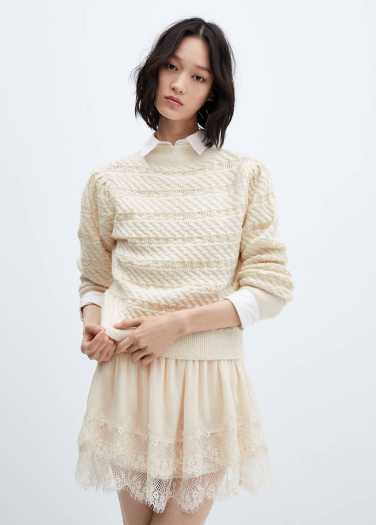 Cuello redondo. Punto medio. Diseño trenzado. Sin cierre. Manga larga. Diseño recto. Diseño estándar. Terminaciones en canalé. Detalles calados