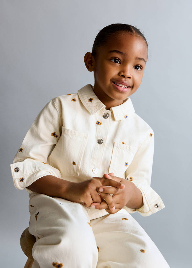 Tejido 100% algodón. Efecto denim. Diseño recto. Diseño bordado. Cuello camisero. Manga larga. Dos bolsillos de parche frontales. Cierre delantero con botones. Total look.