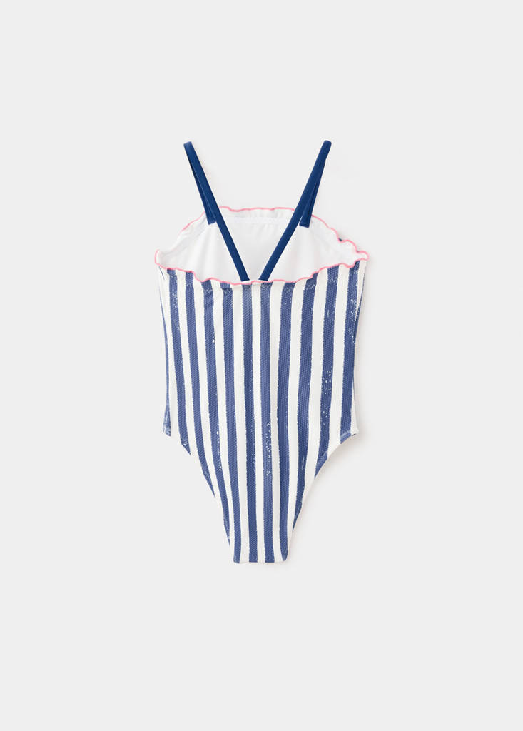 Tejido elástico. Diseño de rayas. Tirantes finos. Texto estampado en el pecho. Detalles festoneados. Colección baño.