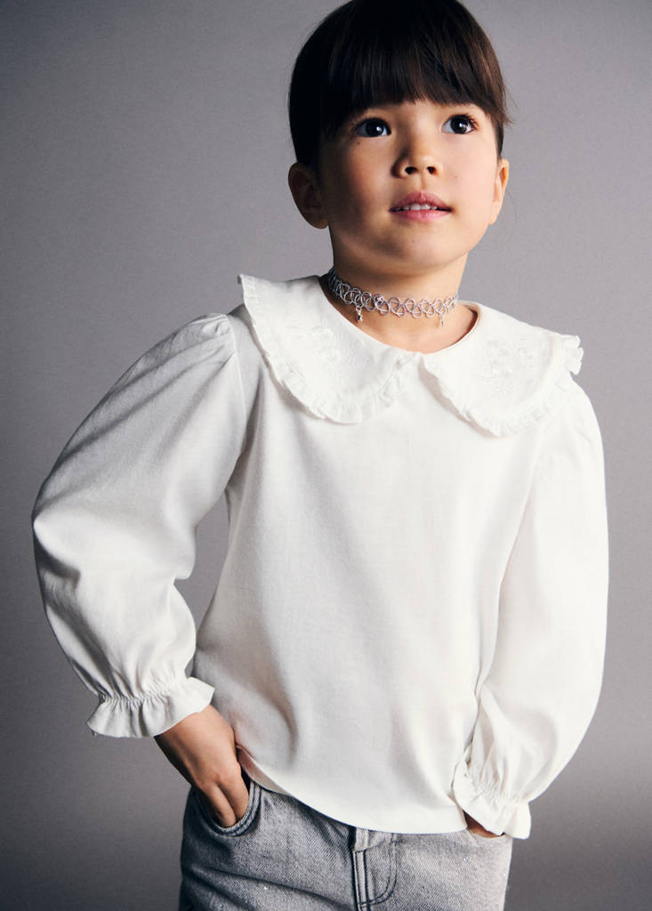 Confeccionada en tejido 100% algodón, esta prenda presenta un diseño recto con un delicado cuello bebé bordado. Incluye cierre de botón en la parte posterior y mangas largas con puños elásticos