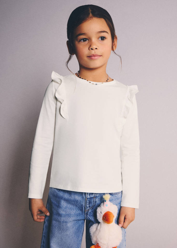 Camiseta algodón volantesPrecio actual [US$ 9,99 ]US$ 9,99Selecciona un colorBlanco rotoSelecciona tu talla9-12 meses (80cm)12-18 meses (86cm)18-24 meses (92cm)2-3 años (98cm)3-4 años (104cm)4-5 años (110cm)5-6 años (116cm)Guía de tallasAñadir a FavoritosVer lookEnvío gratis a tiendaVer disponibilidad en tiendaDescripciónTejido 100% algodón. Diseño recto. Cuello redondo. Volantes en los hombros. Manga larga.Ver detallesCualidades del artículoAlgodón recicladoAl menos 20%Esta fibra se obtiene a partir de restos textiles pre y post consumo que se transforman en nuevos tejidos.Compartir