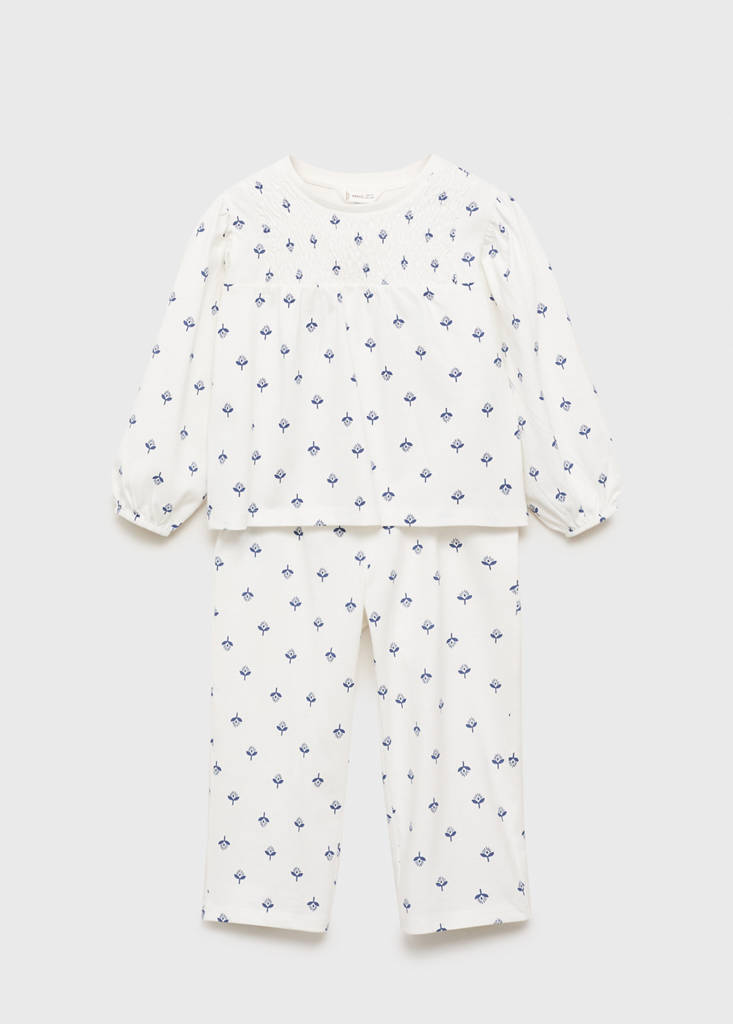 Tejido de algodón. Diseño largo. Diseño estampado. Cuello redondo. Manga larga con puños elásticos. Cintura con goma elástica. Panel nido de abeja. Pijama de dos piezas.