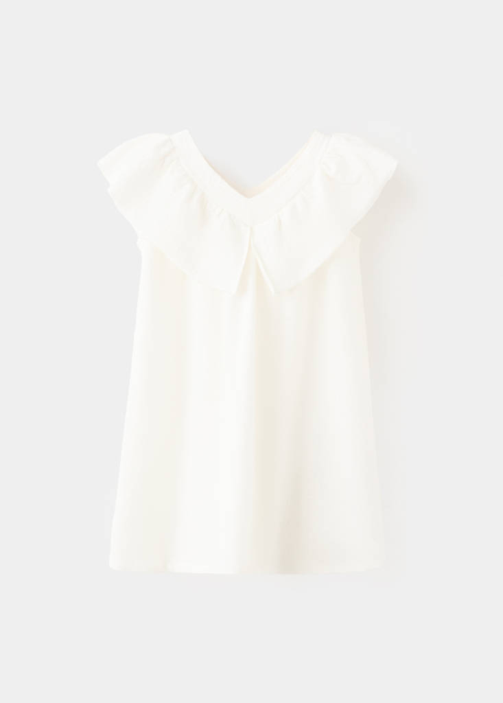 Tejido de algodón. Diseño recto. Diseño corto. Cuello pico. Detalle de volantes en el cuello. Sin cierre.