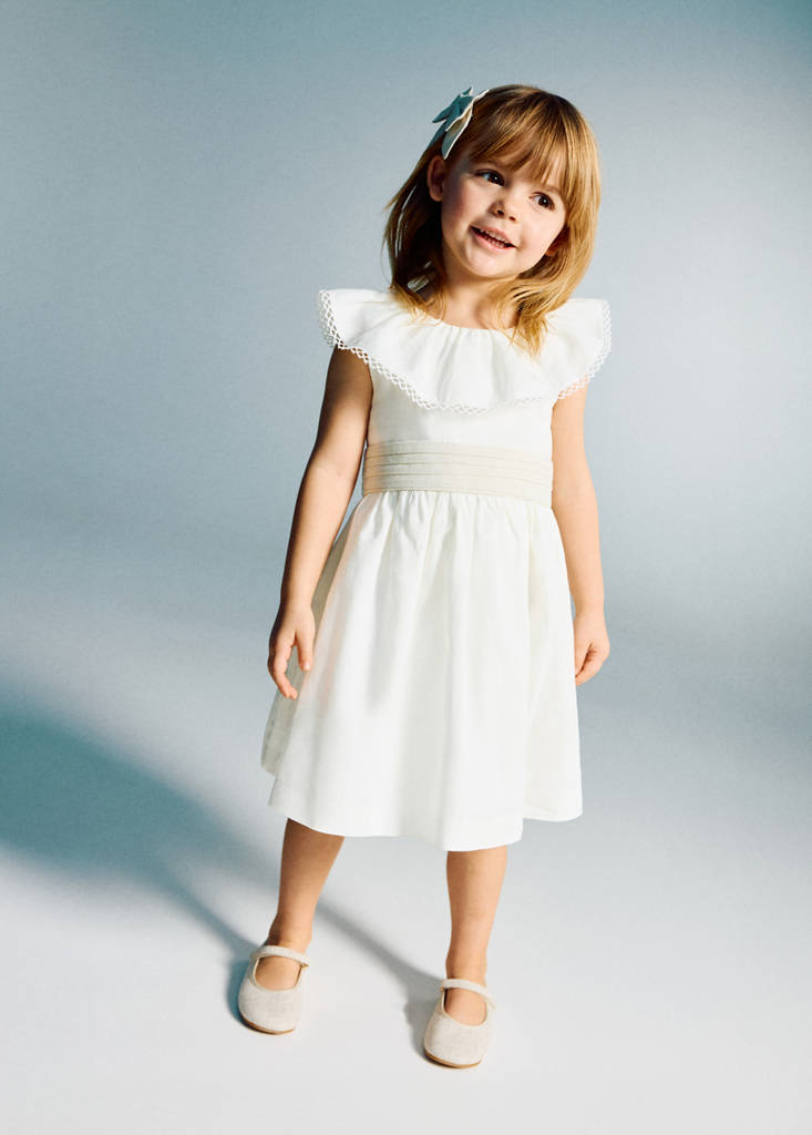 Colección fiesta, ceremonia y comunión. Tejido mezcla de lino y algodón. Diseño recto. Cuello babydoll. Manga corta. Fajín decorativo. Forro interior 100% algodón.