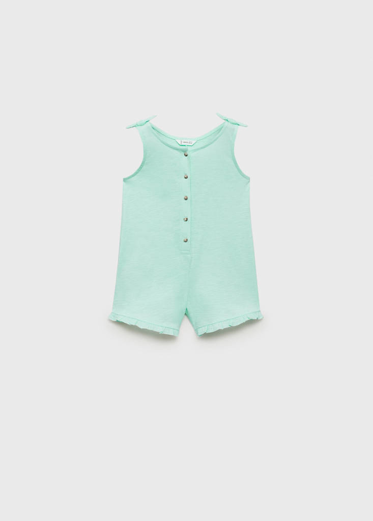 100% Algodón. Diseño recto. Diseño corto. Tirantes anchos. Botones efecto carey. Detalle de lazo en el hombro. Bajo con volante. Cuello redondo. Sin mangas. Cierre delantero.