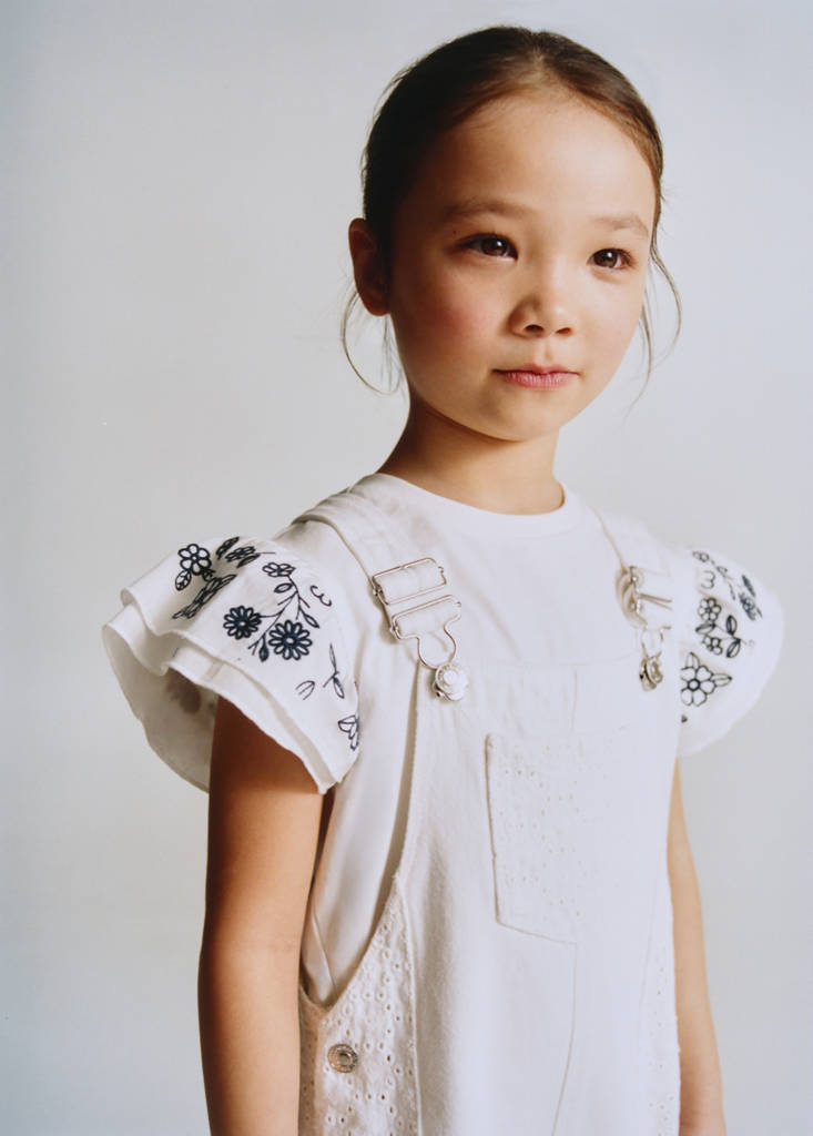 Tejido de algodón estilo tejano vaquero. Diseño recto. Diseño largo. Cuello recto. Tirantes anchos ajustables. Cierre de botones laterales. Bolsillo de parche en el pecho. Detalles bordados calados.