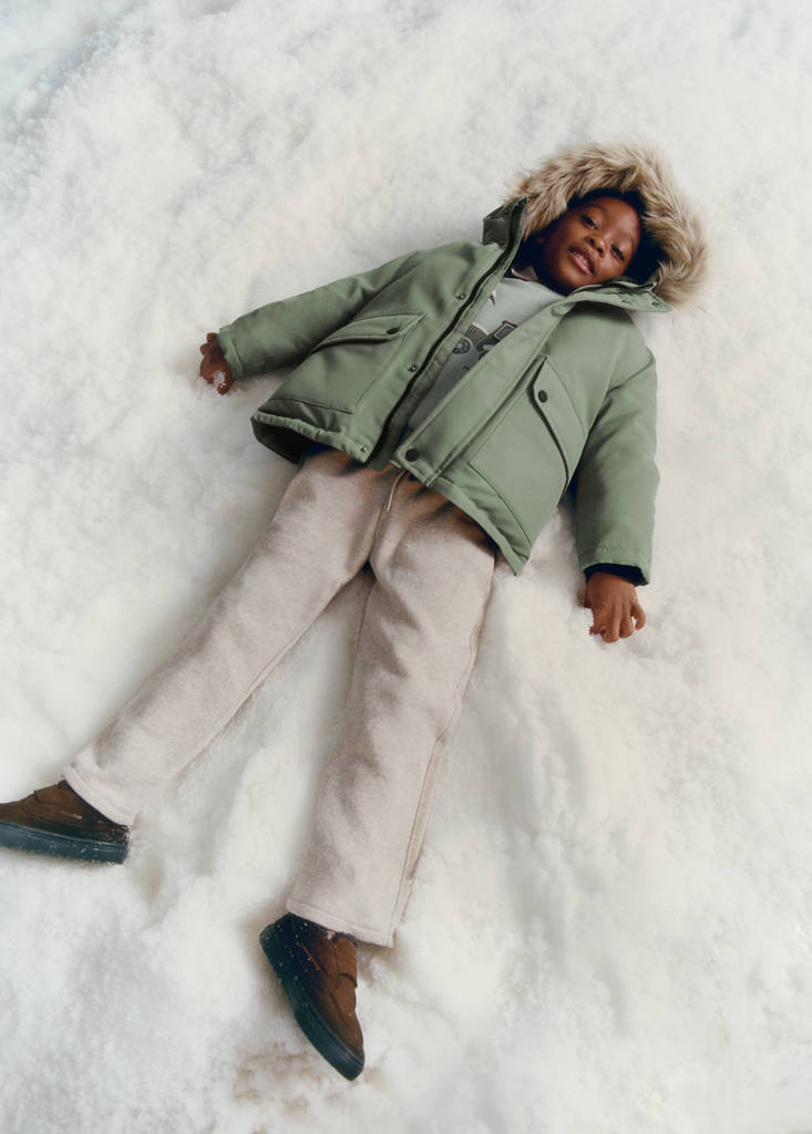 Tejido acolchado. Diseño recto. Con capucha. Capucha con detalle de pelo sintético. Manga larga. Cierre de botón y cremallera. Dos bolsillos laterales.