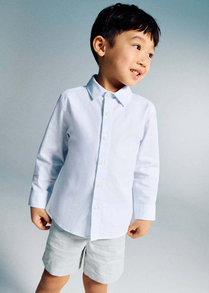Confeccionada en tejido 100% algodón, esta prenda presenta un diseño recto con rayas. Incluye un cuello camisero, manga larga y puños abotonados. El cierre delantero con botones completa su estilo. Forma parte de la colección fiesta y ceremonia