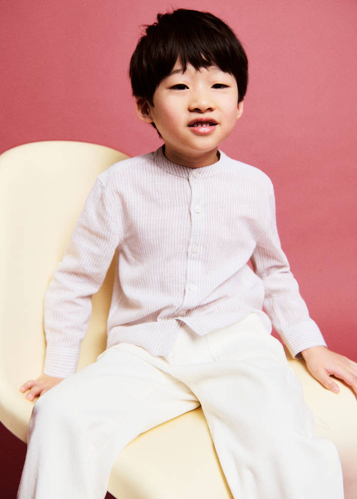 Tejido mezcla de lino y algodón. Diseño de rayas. Diseño recto. Cuello de tira. Manga larga con puños abotonados. Cierre delantero con botones.