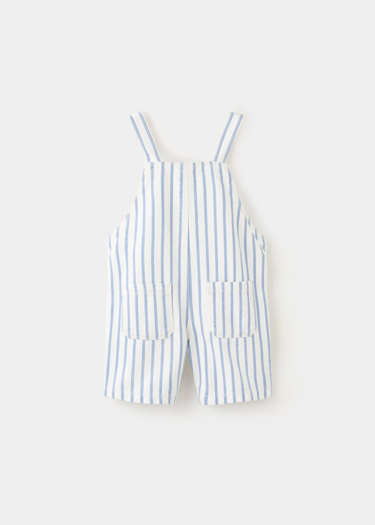 Tejido 100% algodón. Tejido de algodón estilo tejano vaquero. Diseño corto. Estampado Rayas. Diseño recto. Cuello recto. Tirantes ajustables y cierre de ganchos en la parte posterior. Bolsillo parche delantero. Cierre de botones laterales.