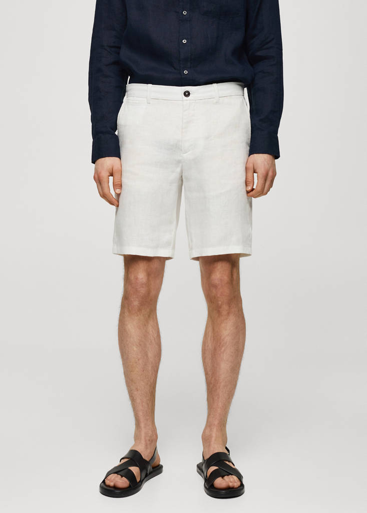 Slim fit. Tejido 100% lino. Trabillas para cinturón. Cierre delantero de doble botonadura y cremallera. Dos bolsillos delanteros. Bolsillo portamonedas. Dos bolsillos de ribete con botón en la parte posterior.