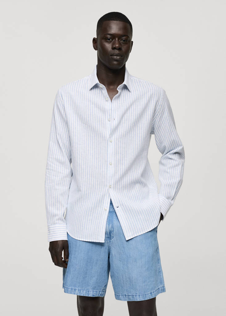 Regular fit. Tejido mezcla de algodón y lino. Cuello camisero. Estampado rayas verticales. Manga larga con puños abotonados. Cierre delantero con botones. Bajo redondeado. La camisa de rayas azul y beige es Exclusivo Online.