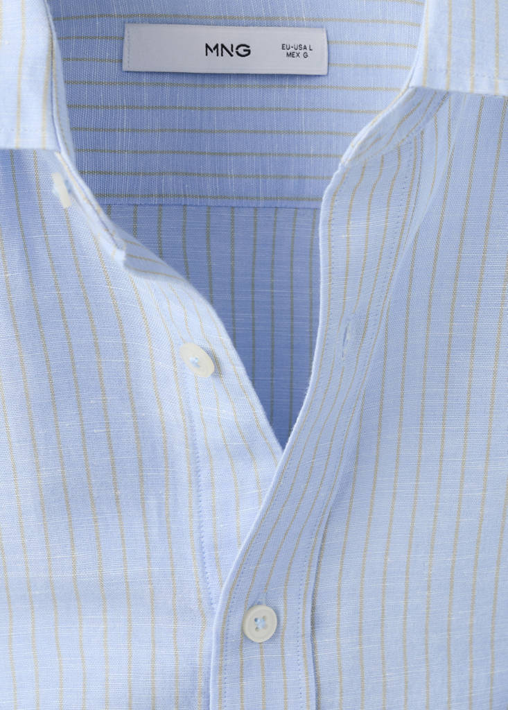 Regular fit. Largo Standard. Tejido mezcla de lino y algodón. Diseño de rayas finas. Manga larga con puños abotonados. Bajo redondeado.