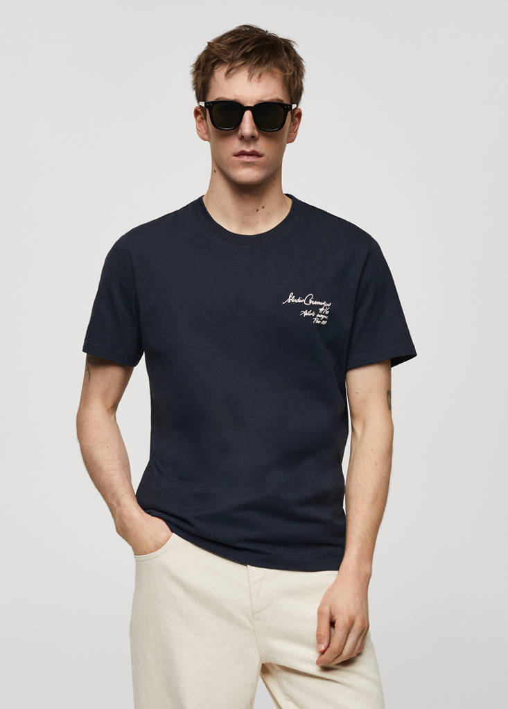 Slim fit. Mensaje estampado en la parte delantera. Cuello redondo acabado rib. Manga corta. Bajo recto. Dibujo estampado en la parte trasera. Tejido 100% algodón.