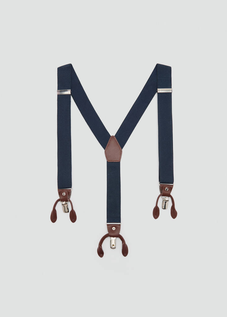 Tirantes elásticos ajustables. Detalles de piel. Enganches de pinza metálica y bastones para botón.
