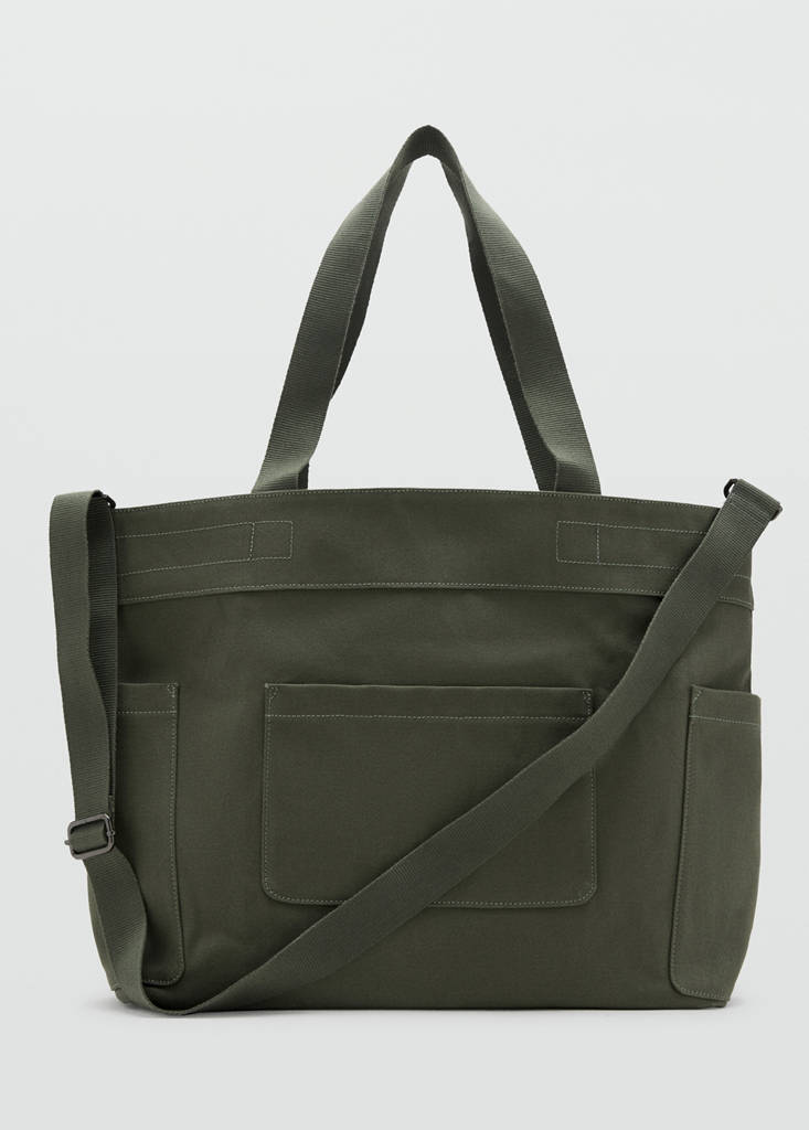 Diseño de bolso tote. Tejido canvas de algodón. Dos asas cortas de mano. Asa larga ajustable bandolera con opción extraíble. Bolsillos exteriores. Bolsillo interior de cremallera. Detalles pespunteados.