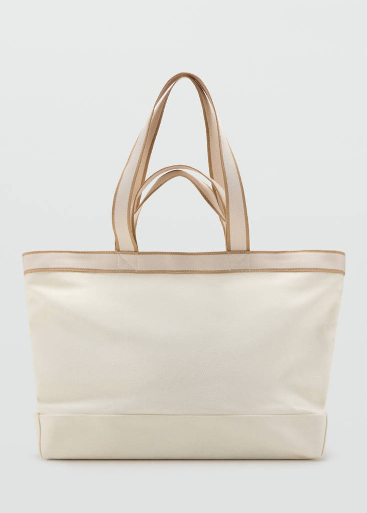 Tejido 100% algodón. Estilo shopper. Ribetes de color en contraste. Dos asas cortas de mano. Doble asa superior. Bolsillo interior con cierre de cremallera. Cierre de botón magnético.
