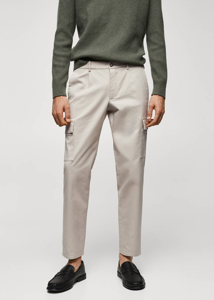 Slim fit. Tejido mezcla de algodón. El color beige es exclusivo online. Diseño cargo. Cierre de cremallera y botón. Trabillas para cinturón. Detalle de pinzas delanteras. Dos bolsillos de parche y solapa en la pierna. Bajo recto