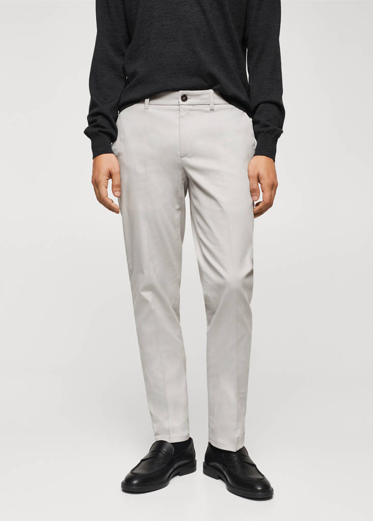 Colección Básicos. Slim fit. Tejido mezcla de algodón sostenible. Tejido de sarga. Estilo chinos. Trabillas. Cierre de cremallera y botones. Dos bolsillos laterales. Dos bolsillos de ribete en la parte posterior. El modelo mide 185 cm y lleva una talla 42