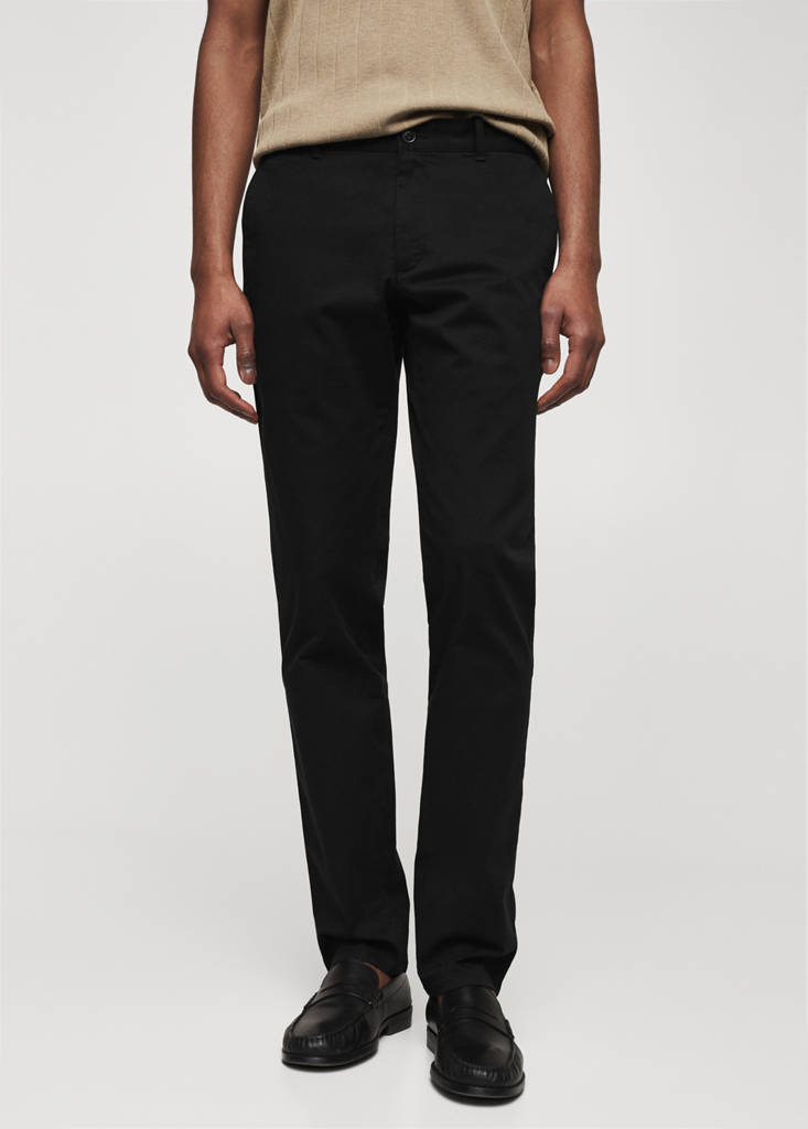 Slim fit. Tejido mezcla de algodón. Ligeramente elástico. Tiro medio. Cierre doble botón y cremallera. Trabillas para cinturón . Cinco bolsillos. Dos bolsillos laterales. Bolsillo portamonedas. Dos bolsillos de ribete en la parte posterior. Diseño largo. Bajo recto. Colección Básicos