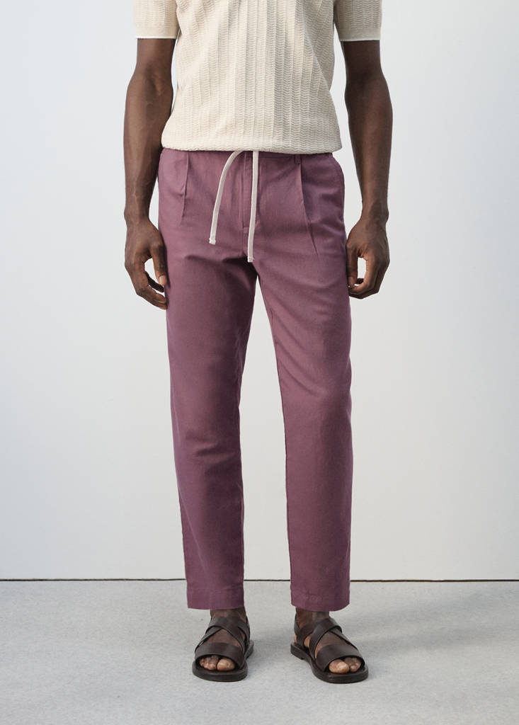 El color negro es exclusivo online. Slim fit. Largo Crop. Tejido mezcla de algodón y lino. Cintura elástica con cordón ajustable. Cordón con opción de anudado visible u oculto en el interior. Trabillas para cinturón. Cierre delantero de doble botonadura y cremallera. Pinzas en la parte delantera. Dos bolsillos delanteros. Dos bolsillos de ribete y botón en la parte posterior.