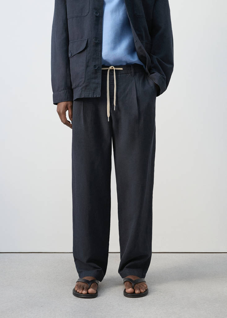 Regular fit. Tejido mezcla de lino y lyocell. Dos bolsillos laterales. Dos bolsillos de ribete en la parte posterior. Cintura con cordón ajustable. Cierre de cremallera y botón. Trabillas para cinturón