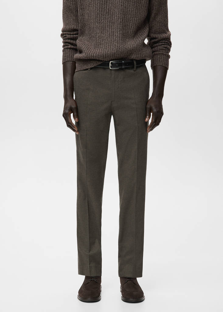 Slim fit. Franela de algodón suave. Detalle de raya planchada en la parte delantera y trasera. Dos bolsillos laterales. Dos bolsillos de ribete y botón en la parte posterior. Trabillas para cinturón. Cierre delantero de doble botonadura y cremallera.