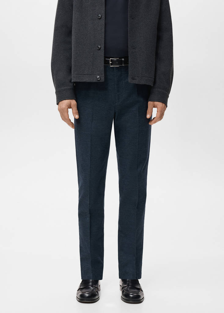 Slim fit. Franela de algodón suave. Detalle de raya planchada en la parte delantera y trasera. Dos bolsillos laterales. Dos bolsillos de ribete y botón en la parte posterior. Trabillas para cinturón. Cierre de cremallera y botón.