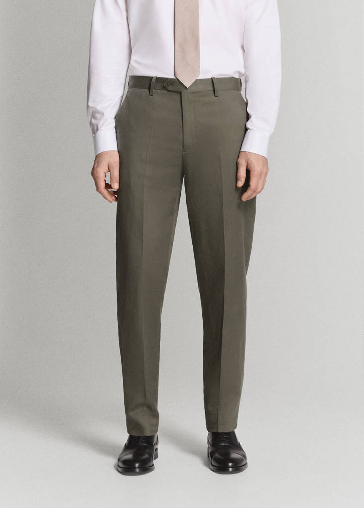 ESSENTIALS: Made to last. Slim fit. Cierre delantero de cremallera, gancho y doble botón. Trabillas para cinturón. Dos bolsillos laterales. Bolsillo portamonedas. Dos bolsillos de ribete y botón en la parte posterior. Detalle de raya planchada en la parte delantera y trasera.
