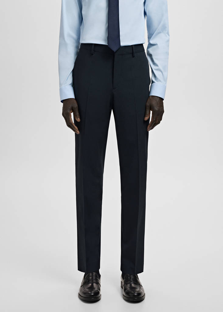 Super slim fit. Tejido mezcla de algodón y viscosa. Detalle de raya planchada en la parte delantera y trasera. Dos bolsillos laterales. Dos bolsillos de ribete y botón en la parte posterior. Trabillas para cinturón. Cierre delantero con cremallera y botones ocultos.