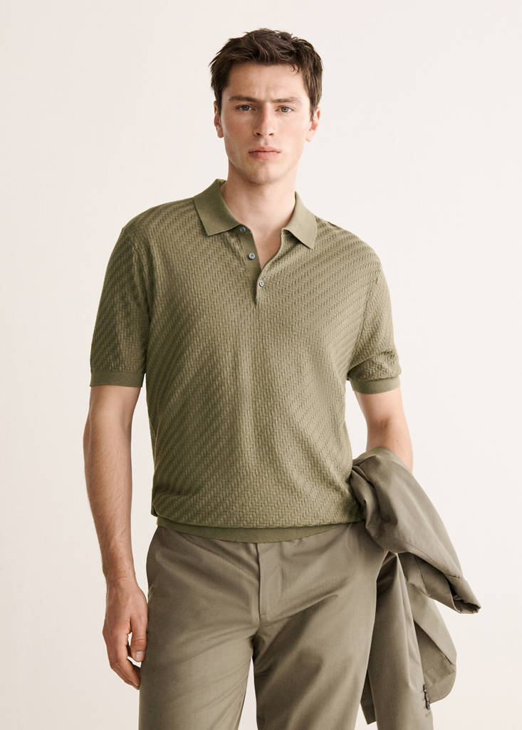 Tejido de punto fino con estructura. Silueta recta. Cuello polo con cierre de botones. Cuello, mangas y bajo acabados en canalé. Manga corta. Bajo recto