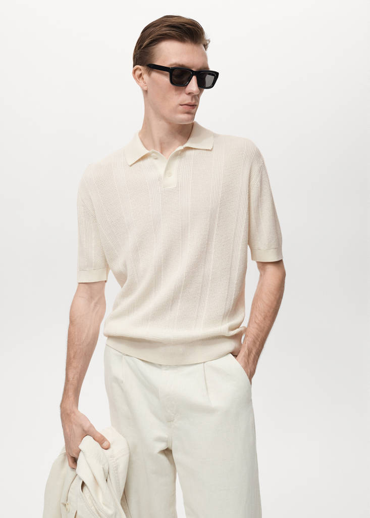 Polo punto calado estructura rayasPrecio actual [US$ 69,99 ]US$ 69,99Selecciona un colorCrudoEl modelo lleva la talla M y mide 189cm.Selecciona tu tallaSMLXLXXLMedidasAñadir a FavoritosVer lookEnvío gratis a tiendaEl color beige es exclusivo online. Regular fit. Tejido 100% algodón. Cuello polo con cierre de botones. Cuello, mangas y bajo acabados en canalé. Manga cortaDetalles, composición y cuidadosDisponibilidad en tienda