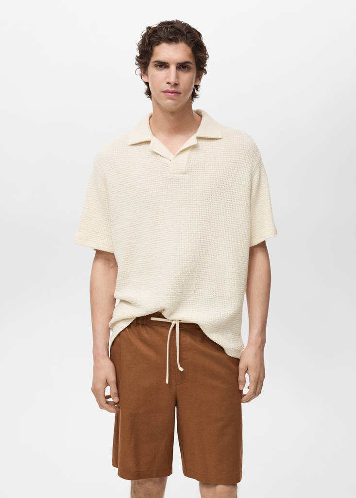 Tejido de algodón. Relaxed fit. Diseño crochet. Cuello bowling sin botones. Manga corta.