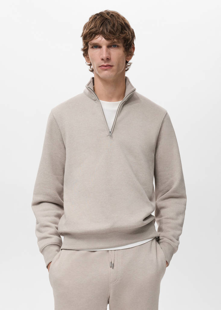 El color marrón medio es exclusivo online. Regular fit. Tejido mezcla de algodón. Cuello perkins con cierre de cremallera. Puños y bajo acabado en rib. Bajo recto.