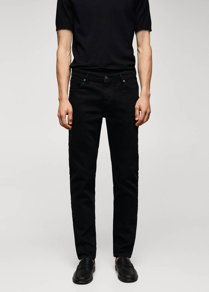 Colección Básicos. Slim fit. Tejido mezcla de algodón sostenible. Trabillas. Dos bolsillos laterales. Bolsillo portamonedas. Dos bolsillos de parche en la parte posterior. Cierre de cremallera y botón. Estilo tejano vaquero. Este pantalón dispone de tallas con un largo extra de 5 cm que ayudan a mantener el fit original sea cual sea tu altura. Tejido de algodón. Color negro. Trabillas para cinturón
