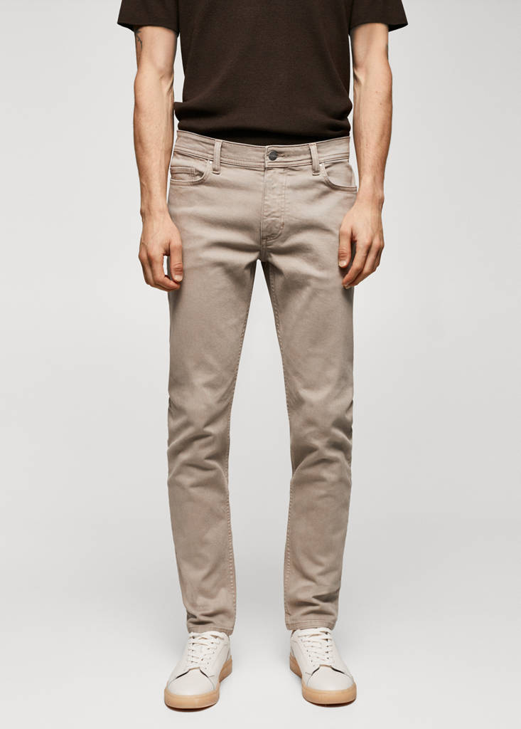 Colección Básicos, slim fit, tejido mezcla de algodón sostenible, trabillas, dos bolsillos laterales, bolsillo portamonedas, dos bolsillos de parche en la parte posterior, cierre de cremallera y botón, el modelo mide 185 cm y lleva una talla 42, estilo tejano vaquero.